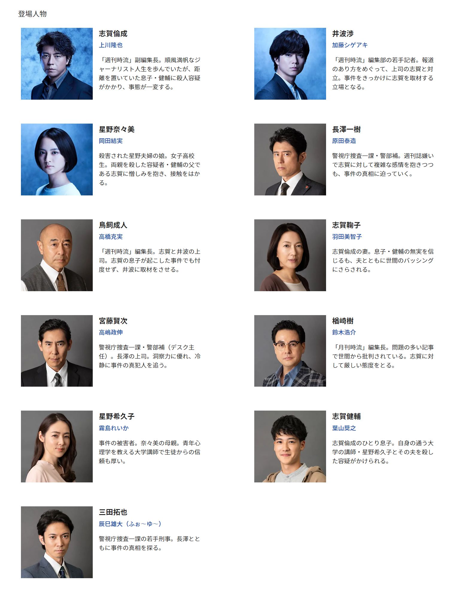 副編集長の志賀倫成(上川隆也)はジャーナリストとしての自負を持ち、部下で記者の井波渉(加藤シゲアキ)を厳しく指導していた。